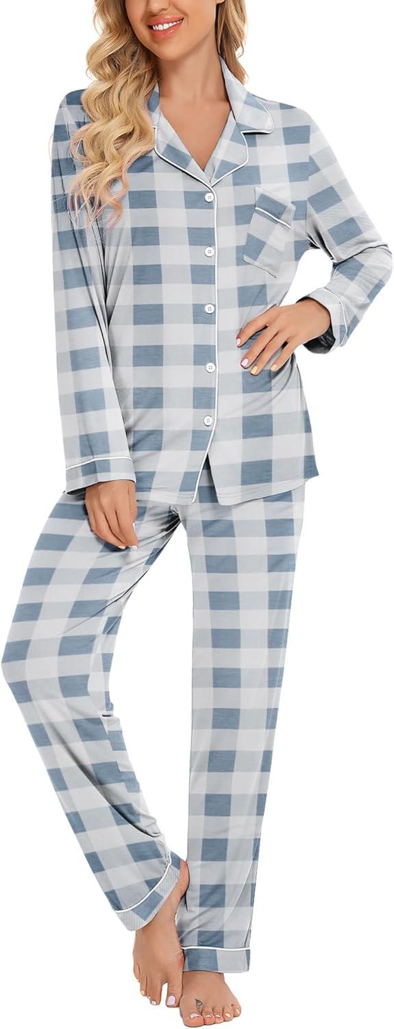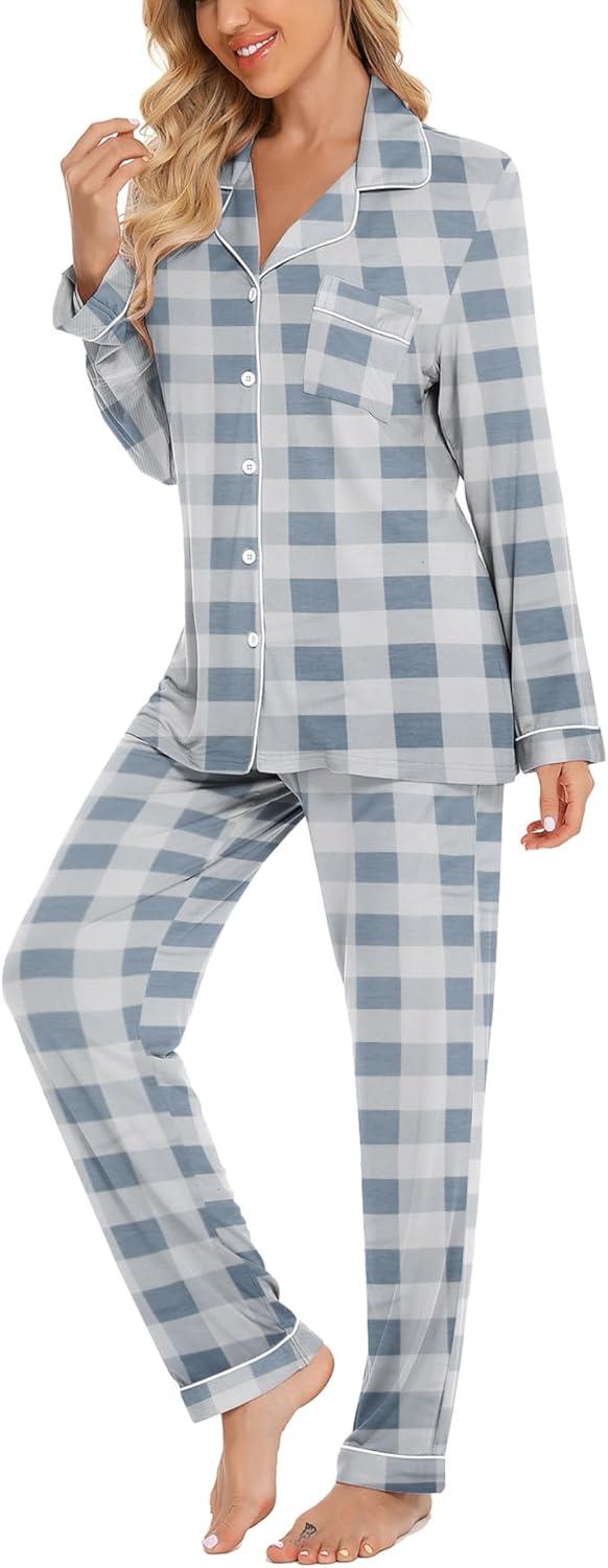 Leikar Button Up Pajama Set For Women Long Sleeve Shirt And Pajama Pants Soft Pjs Lounge Sets(Blue Plaid)