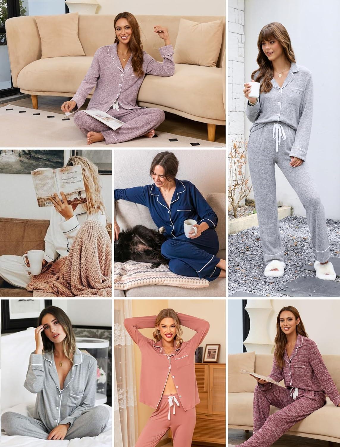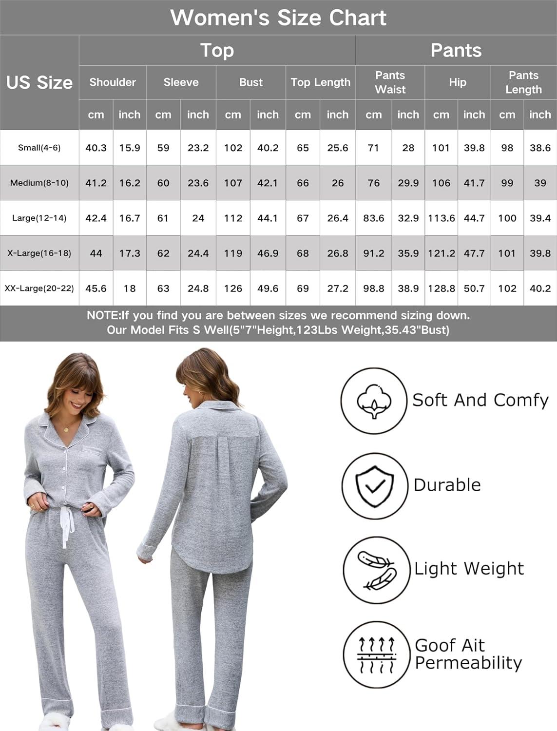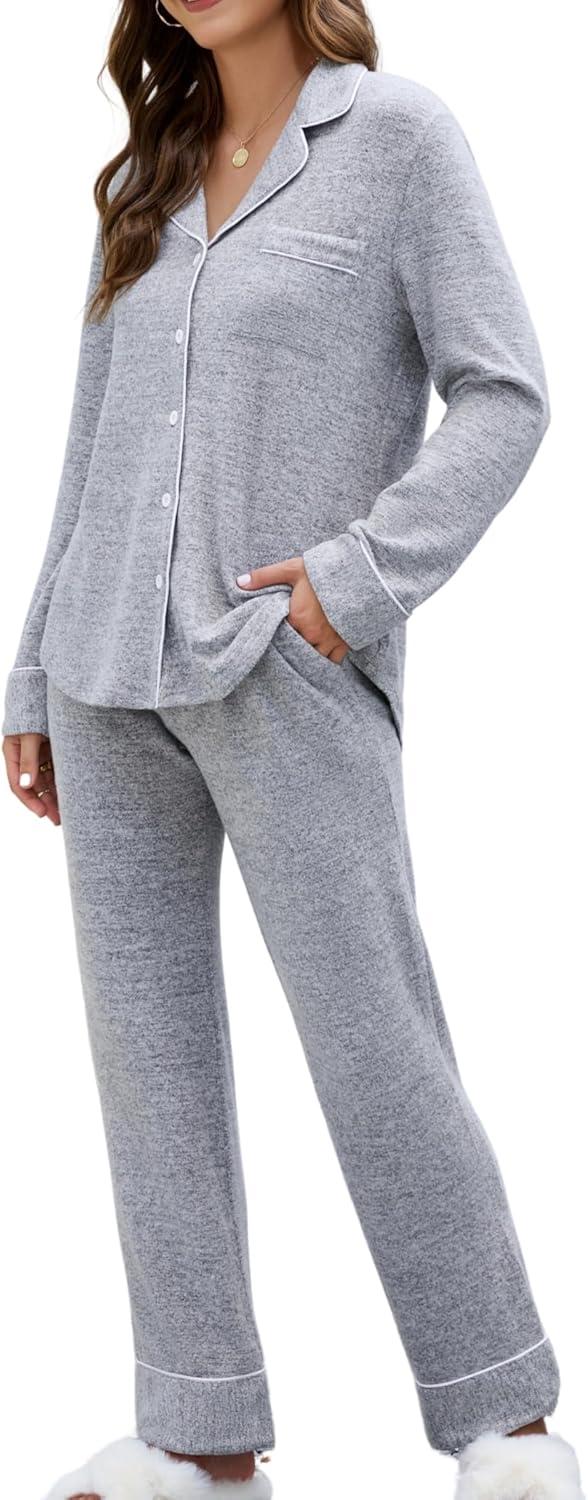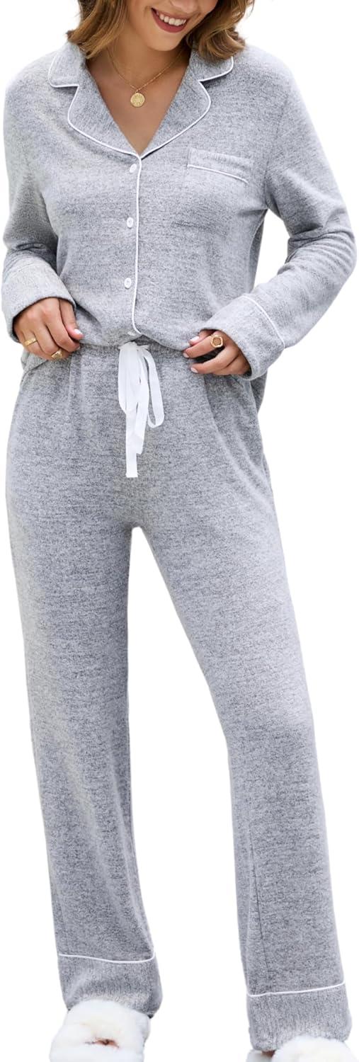 Leikar Button Up Pajama Set For Women Long Sleeve Shirt And Pajama Pants Soft Pjs Lounge Sets(Thickened Gray)