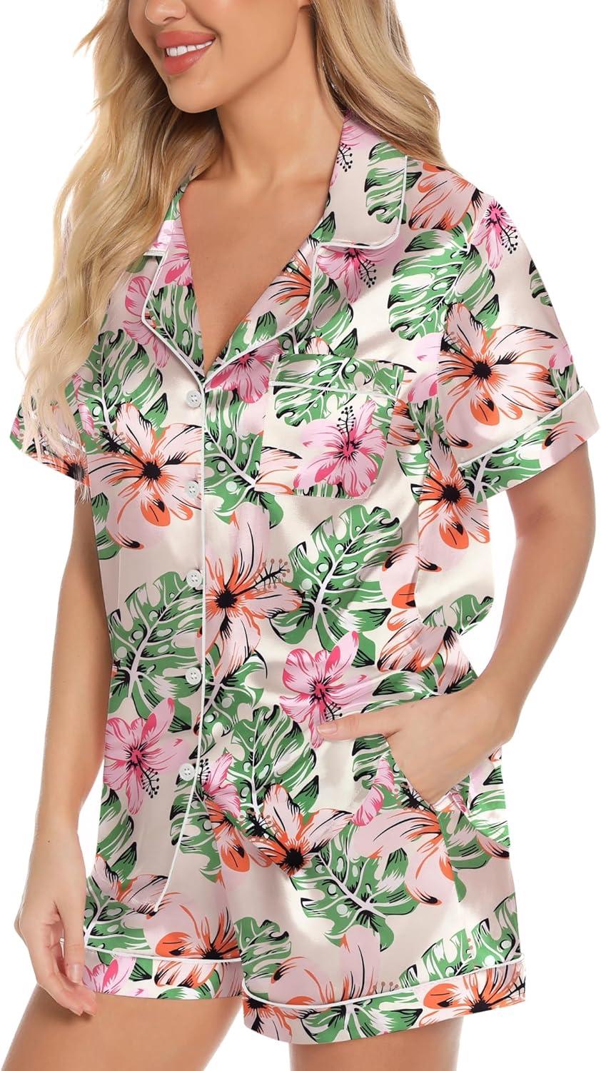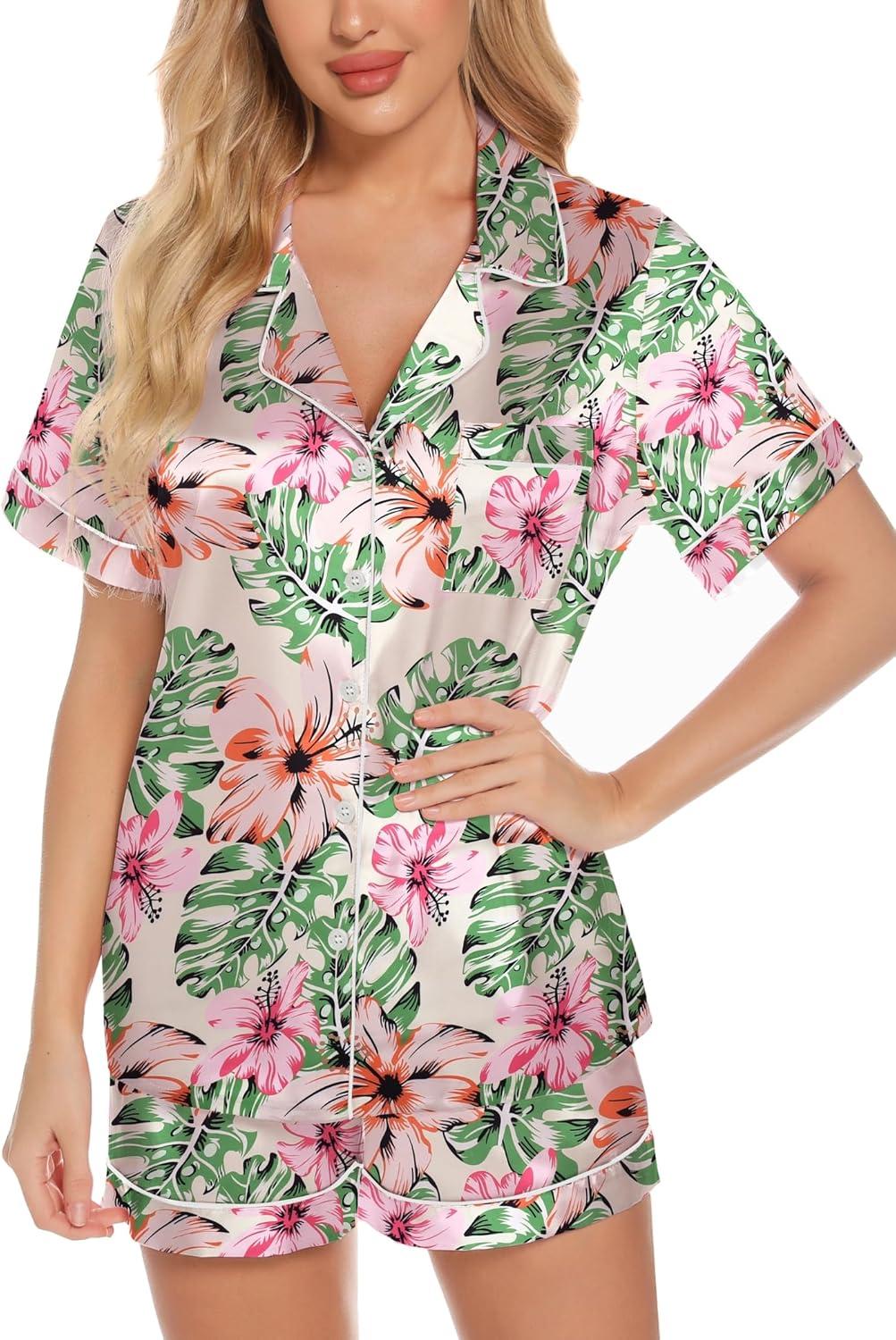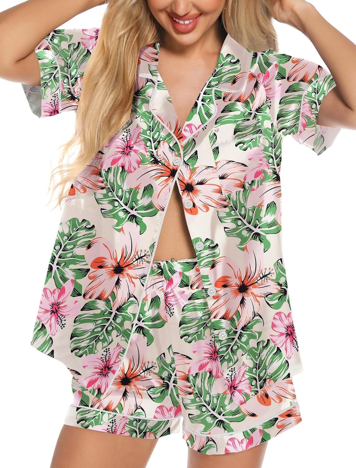 Leikar Silk Pajamas For Women Button Down Pajamas Satin PJ Set Soft Sleepwear(Floral Coconut Tree)