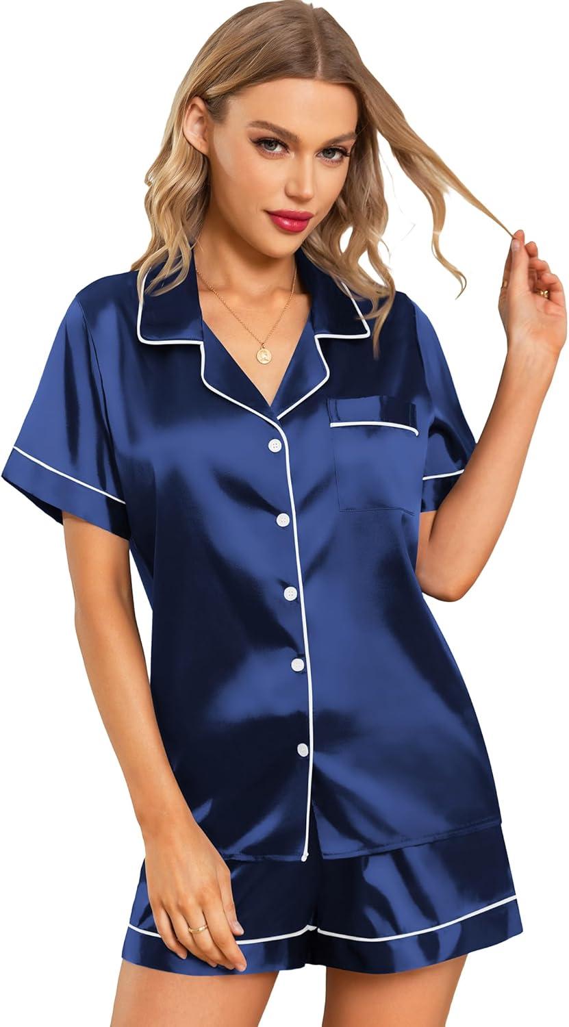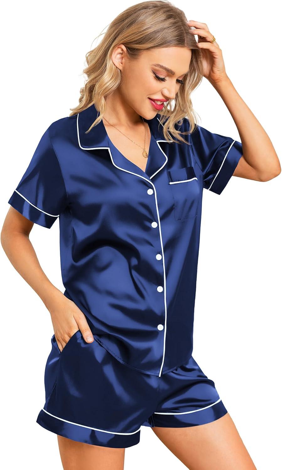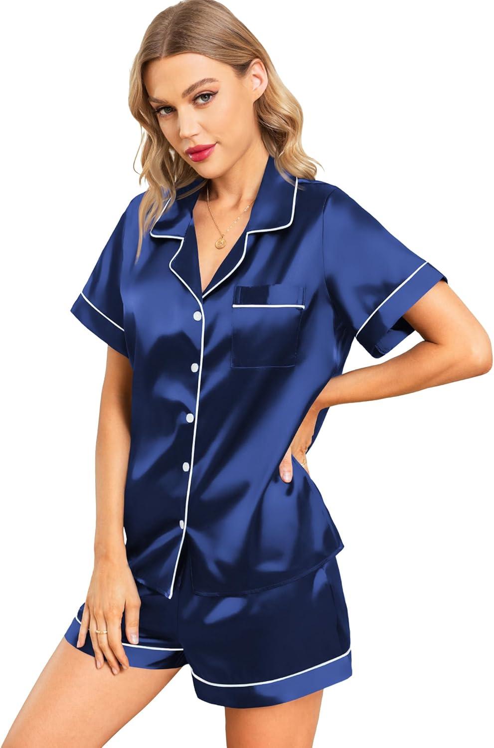 Leikar Silk Pajamas For Women Button Down Pajamas Satin PJ Set Soft Sleepwear(Navy Blue)