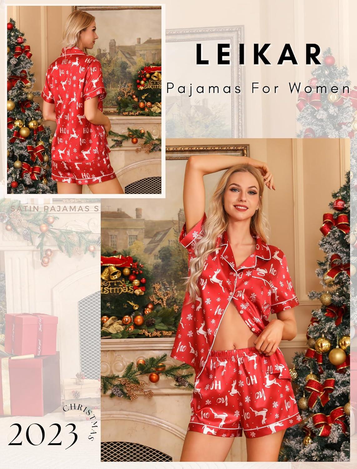 Leikar Silk Pajamas For Women Button Down Pajamas Satin PJ Set Soft Sleepwear(Red Elk)