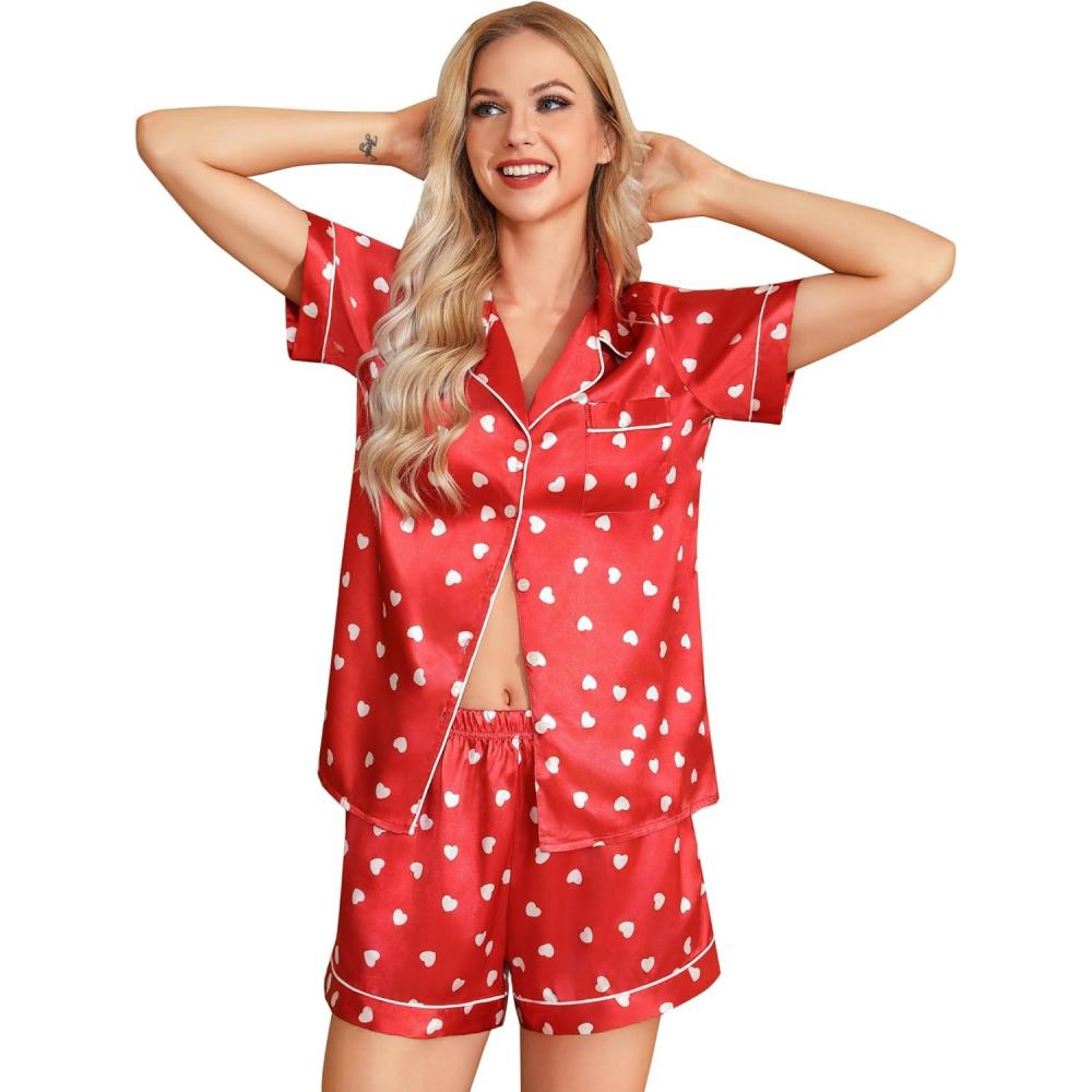 Leikar Silk Pajamas For Women Button Down Pajamas Satin PJ Set Soft Sleepwear(Red Love)