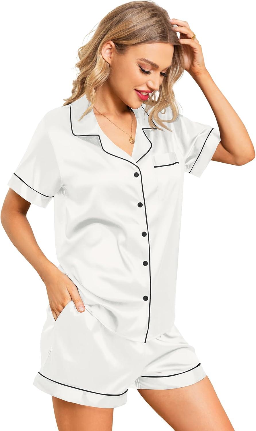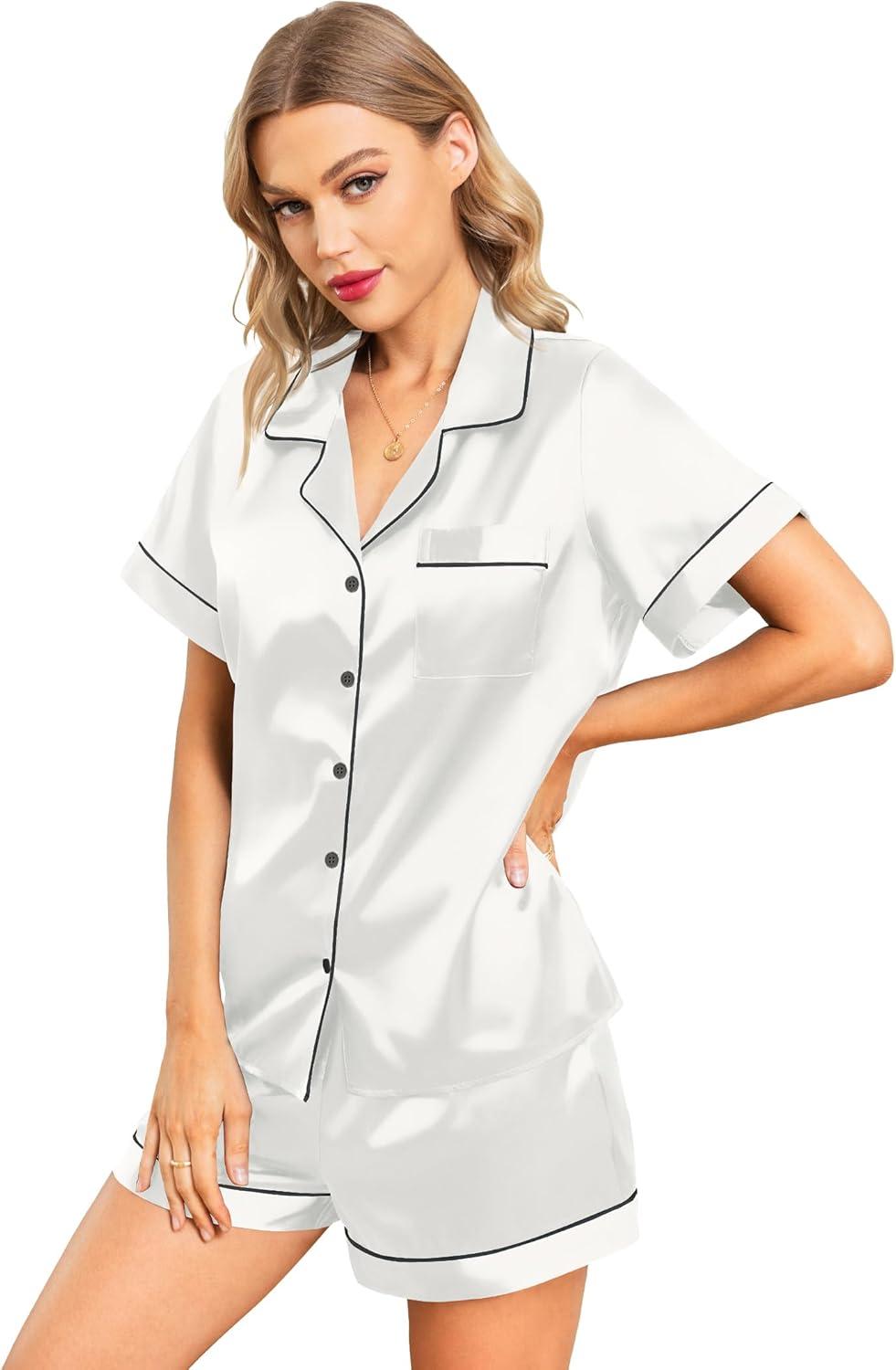 Leikar Silk Pajamas For Women Button Down Pajamas Satin PJ Set Soft Sleepwear(White)