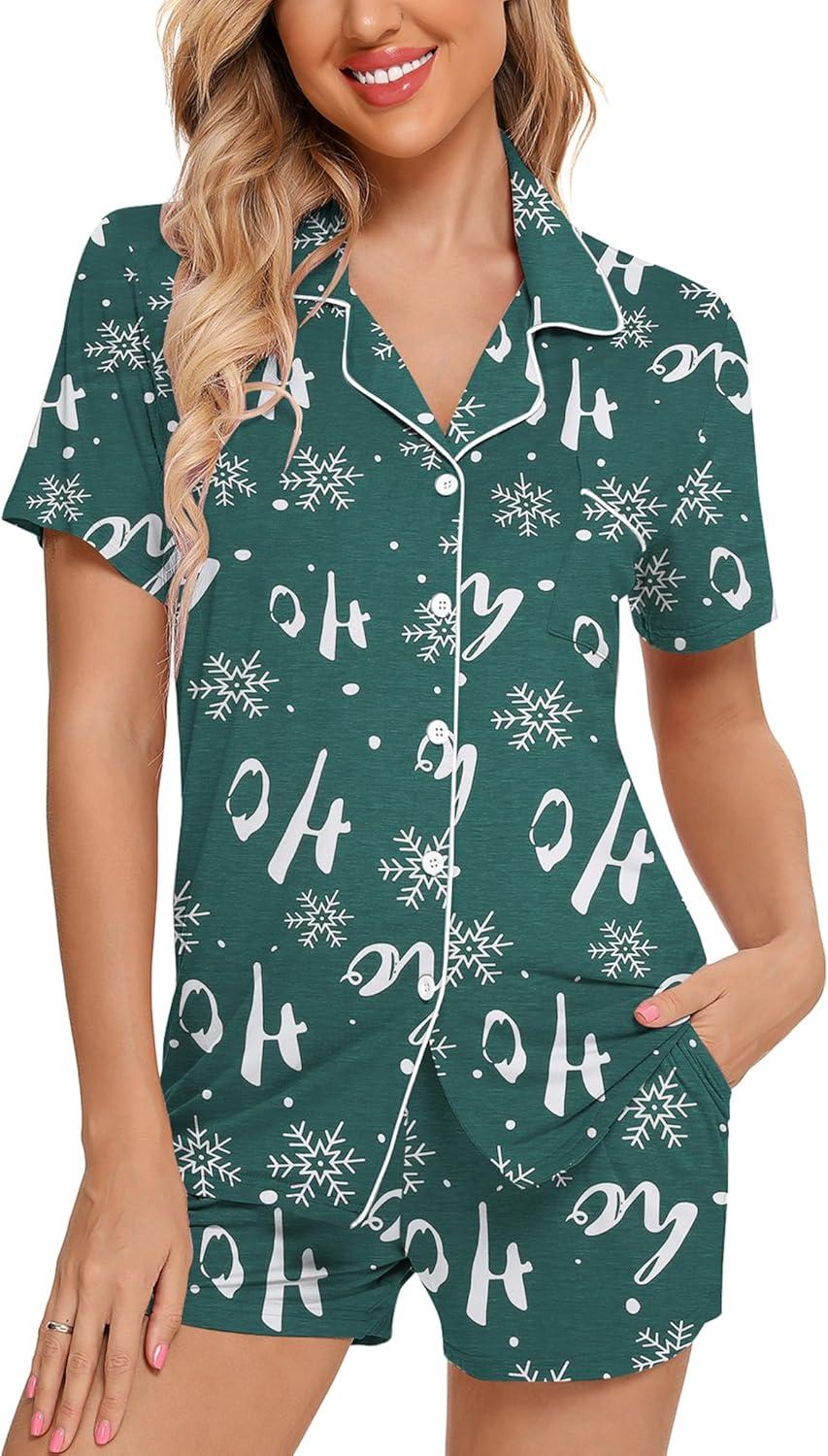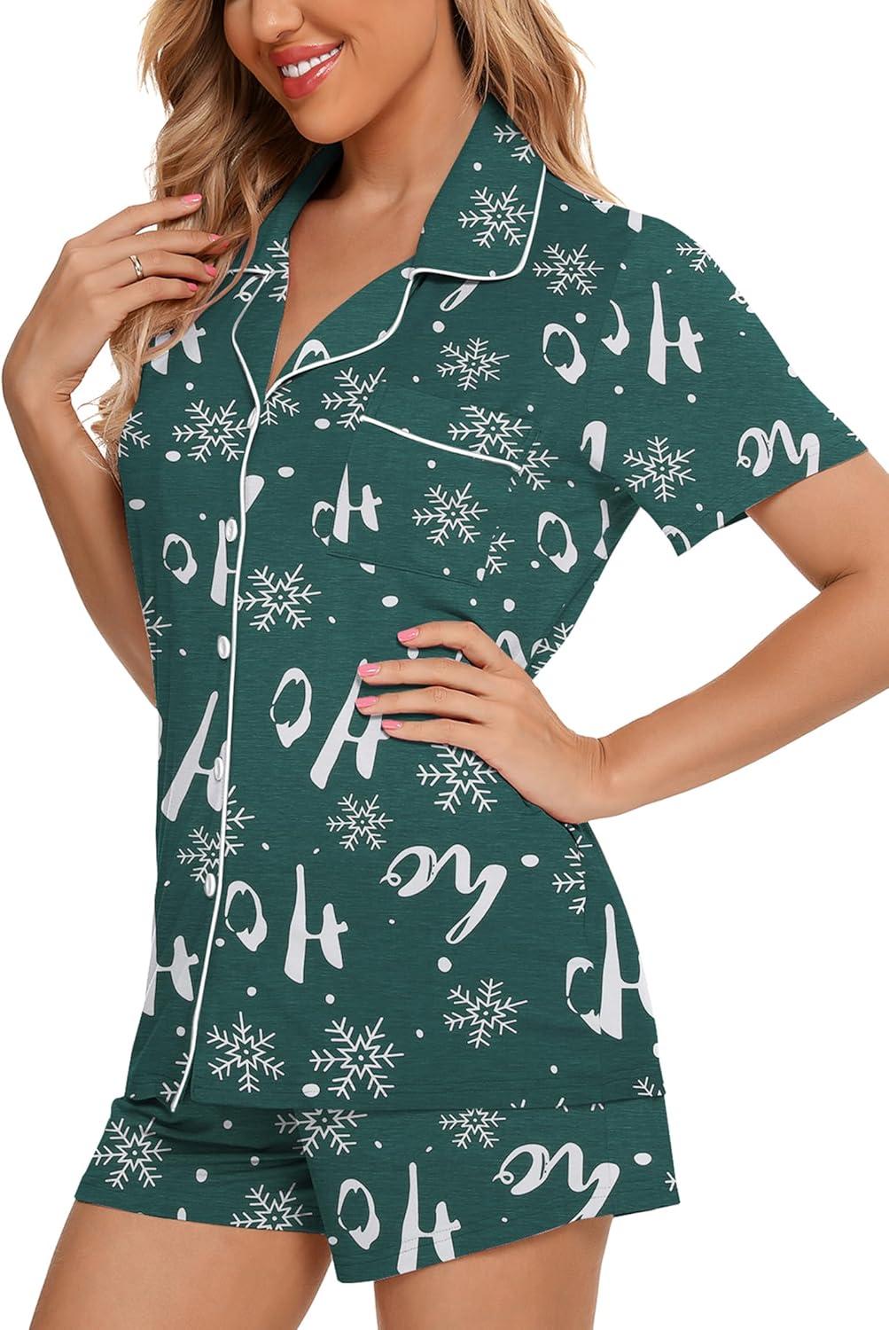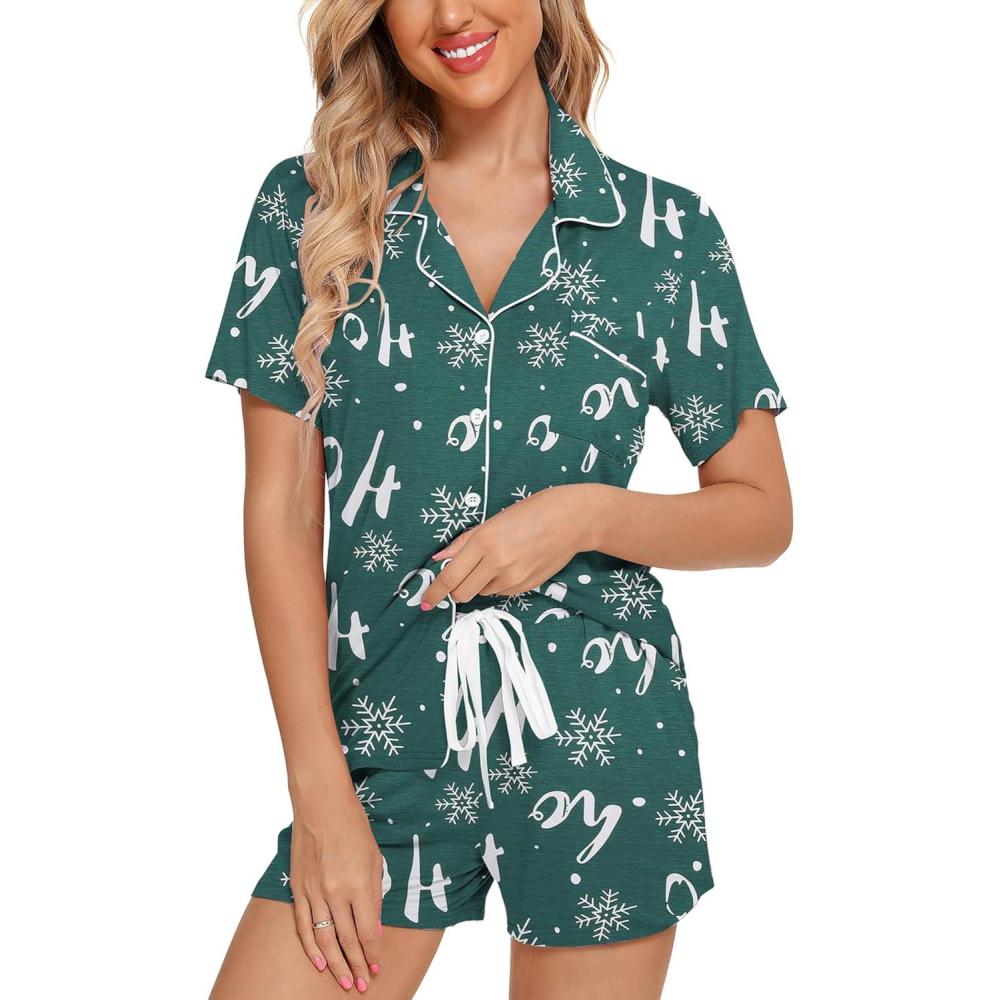 Leikar Womens Button Down Pajama Sets Bride Pajamas Sets Sleepwear Shorts Lounge Set(A-green Snow(with Shorts Pocket))